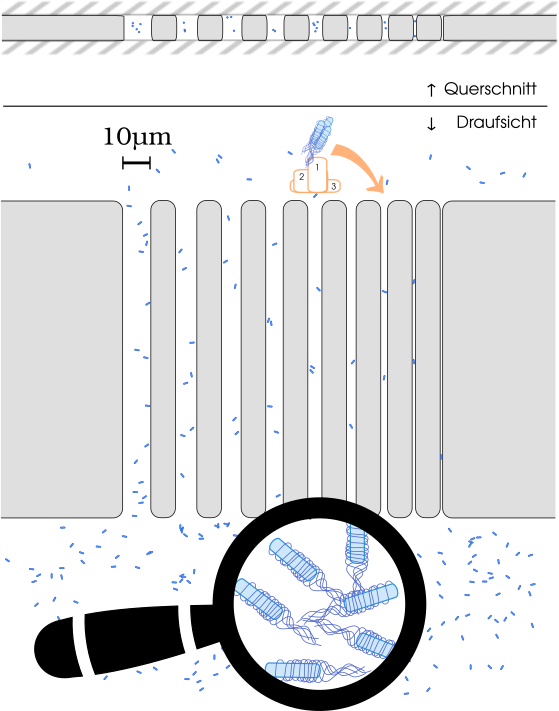 Bakterien schwimmen in engen Kanälen schneller als im offenen Gelände. Die Nähe zu den Wänden hilft ihnen bei der Bewegung. Außerdem meiden sie die Kanalmitte.