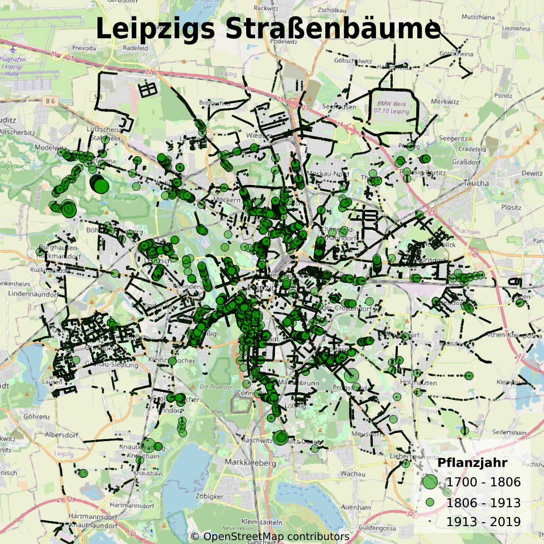Die Art und der Standort jedes Straßenbaumes in Leipzig hat das Amt für Stadtgrün und Gewässer gezählt und veröffentlicht. 60414 Eschen, Eichen und Linden, Apfel-, Birnen- und Kirschbäume, Kastanien, Kiefern, Fichten und Tannen säumten am 16. März 2020 Leipzigs Straßen. Bäume in Stadtparks, Hinterhöfen oder Privatgärten sind dabei nicht mitgezählt.